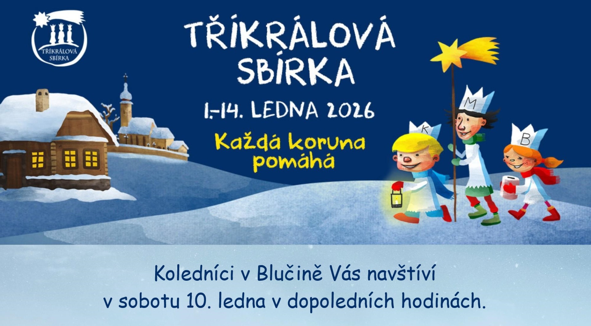 Tříkrálová sbírka: V Blučině v sobotu 10. 1. od 9 hod., v Žabčicích také v sobotu 10. 1. od 13 hod. a v Měníně v neděli 11. 1. po mši sv.. V Přísnoticích již probíhá podle ohlášeného harmonogramu. Podrobnosti na letácích a v obecním rozhlase.